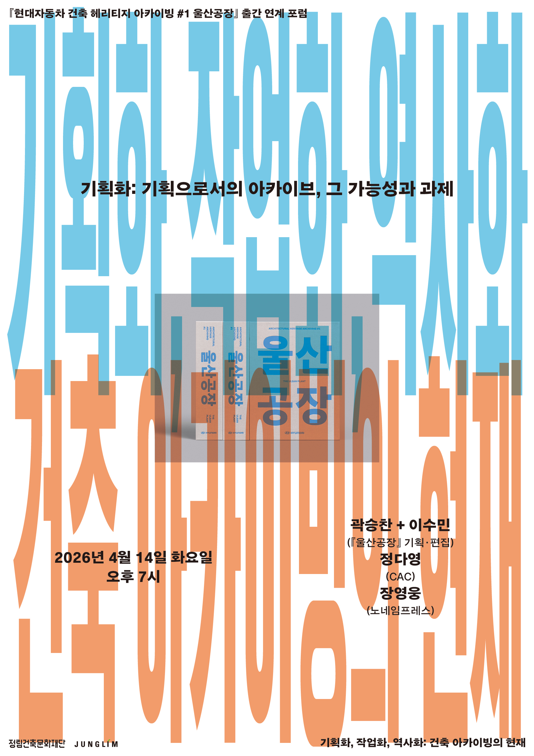『울산공장』은 현대자동차가 발행하고 정림건축 아카이브팀이 제작한 현대자동차 건축 헤리티지 아카이빙 프로젝트의 첫 번째 출간물입니다. 출간을 기념한 연계 포럼에서는 책의 조건과 가능성을 통해 논의를 확장합니다. 이 프로젝트가 위치하고 드러내는 오늘날 건축 아카이빙의 경향성을 기획화, 작업화, 역사화라는 세 개의 열쇳말로 파악하고, 각각의 상황을 점검하고 공유해봅니다. |