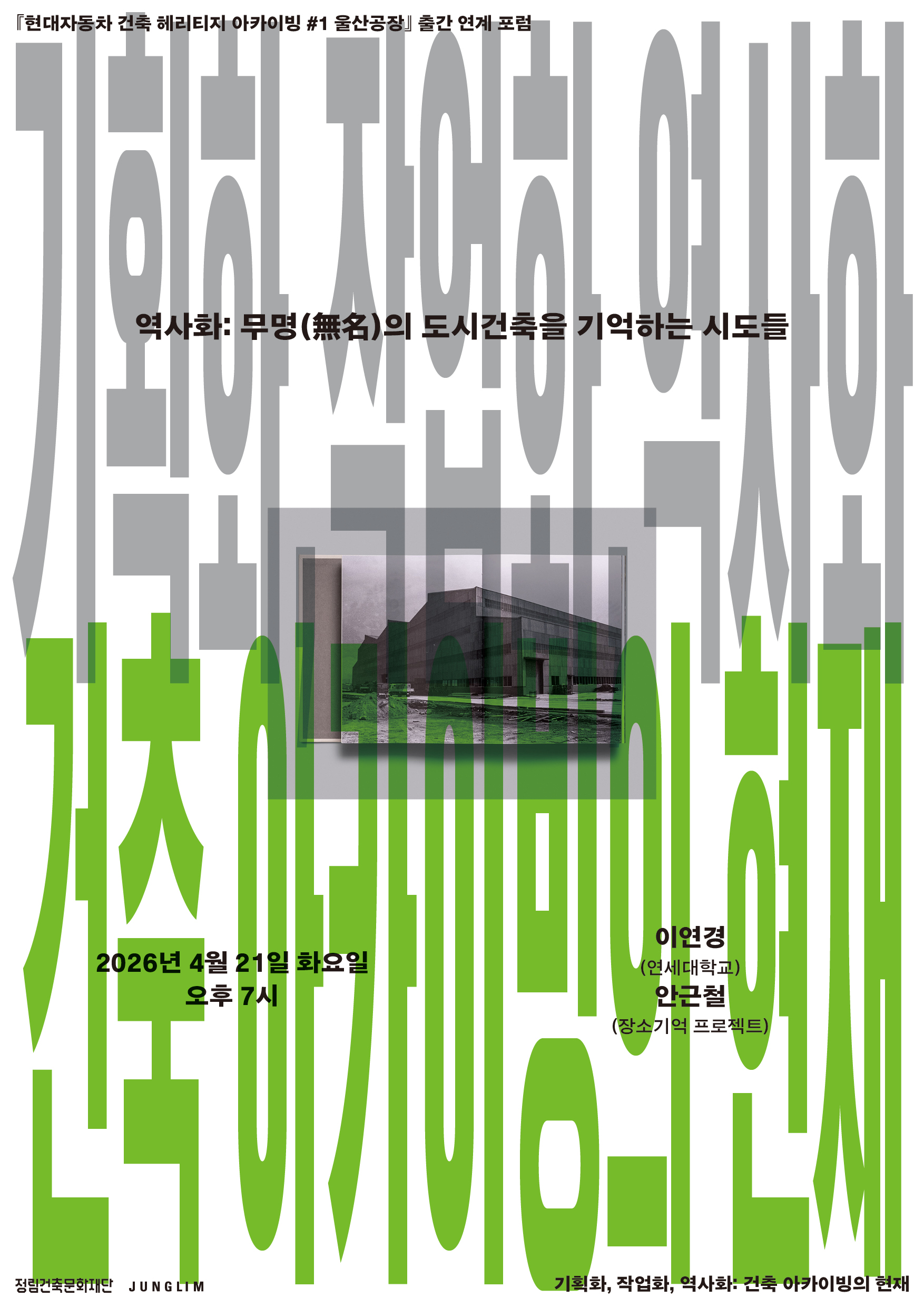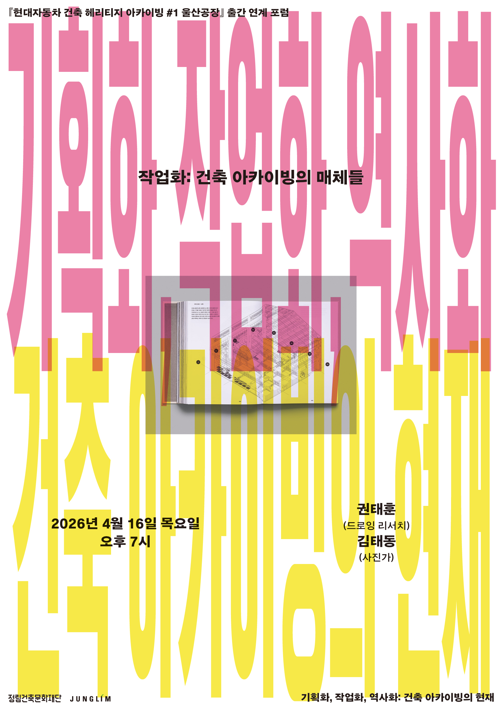 이번 뉴스레터에서는 두 가지 소식을 전합니다. 먼저, 포럼 시리즈 ‘건축 아카이빙의 현재’가 열립니다. 『울산공장』 출간을 기념하여 정림건축 아카이브팀과 공동 기획한 포럼으로, 건축 아카이브를 구축하는 과정과 방법론, 경향을 기획화, 작업화, 역사화 세 키워드로 나누어 조명합니다. 다음으로 정림학생건축상 2026 ‘우리 어떡해’ 최종 결과와 수상작 웹 아카이브 공개 소식을 전합니다. ‘나’와 ‘우리’의 건축과 미래를 향한 질문을 되새겨보는 아카이브가 많은 분들께 닿기를 바랍니다. ⌨활자공 |