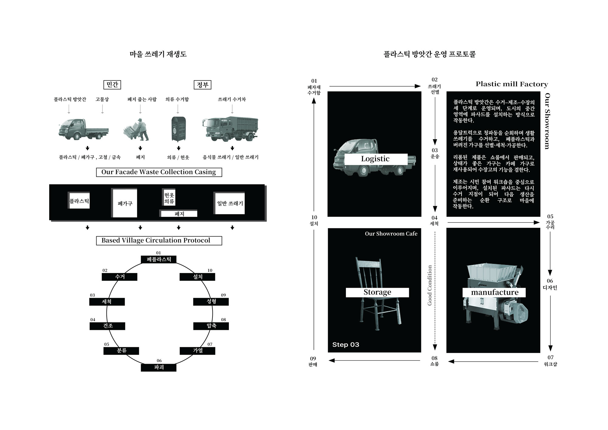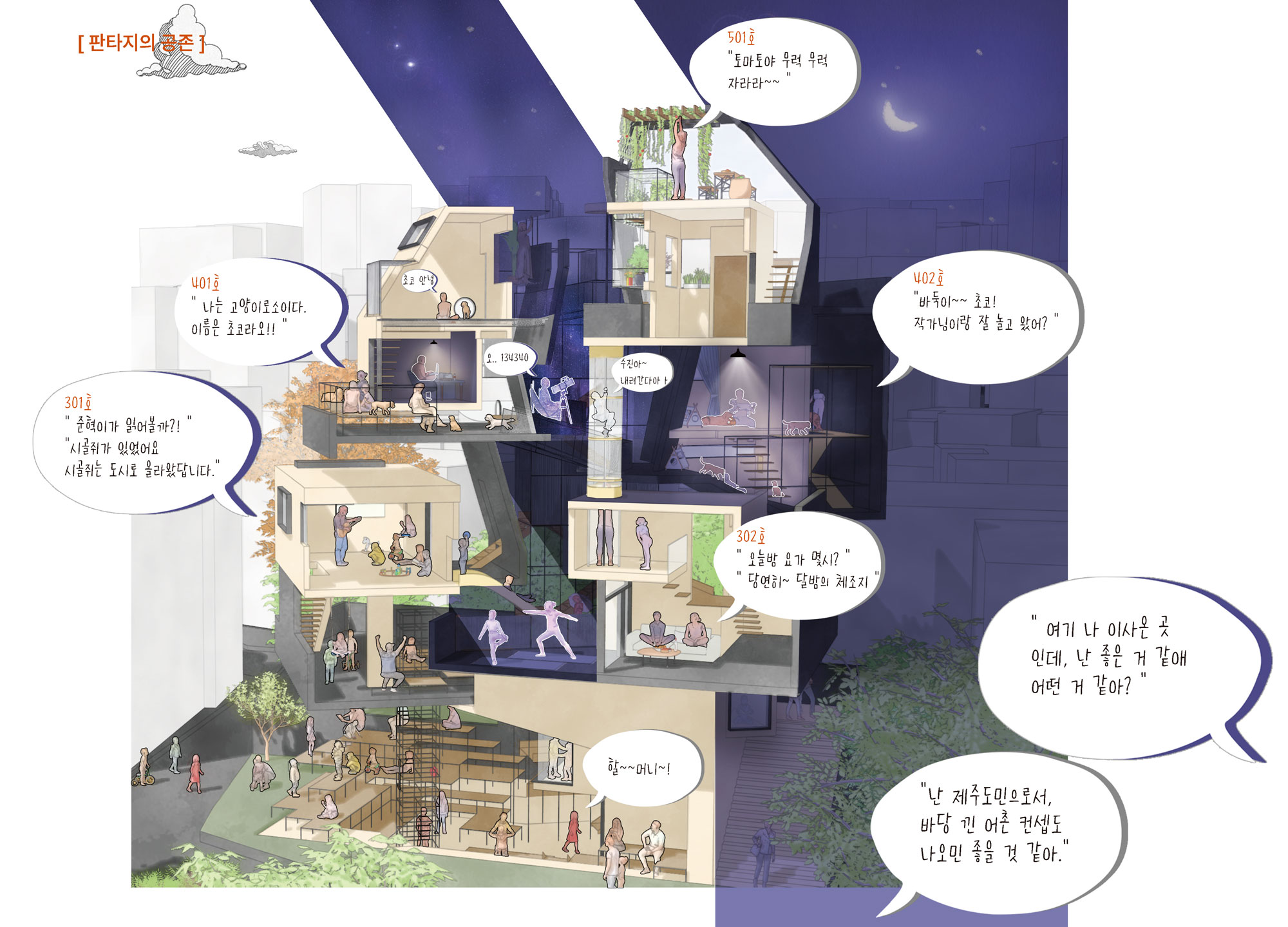 "(...) 삭막한 도시에서도 ‘나’로서, 동시에 ‘우리’로서 살아가기 위해 우리는 시골 마을을 도시 안에 재현해 보려 한다. 다만 도시는 협소하기에 시골 마을을 그대로 구현할 수는 없다. 따라서 우리는 도시의 밀도에 맞춰 수평으로 펼쳐져 있던 시골 마을을 수직으로 세워 올릴 것을 제안한다. (...)" |
