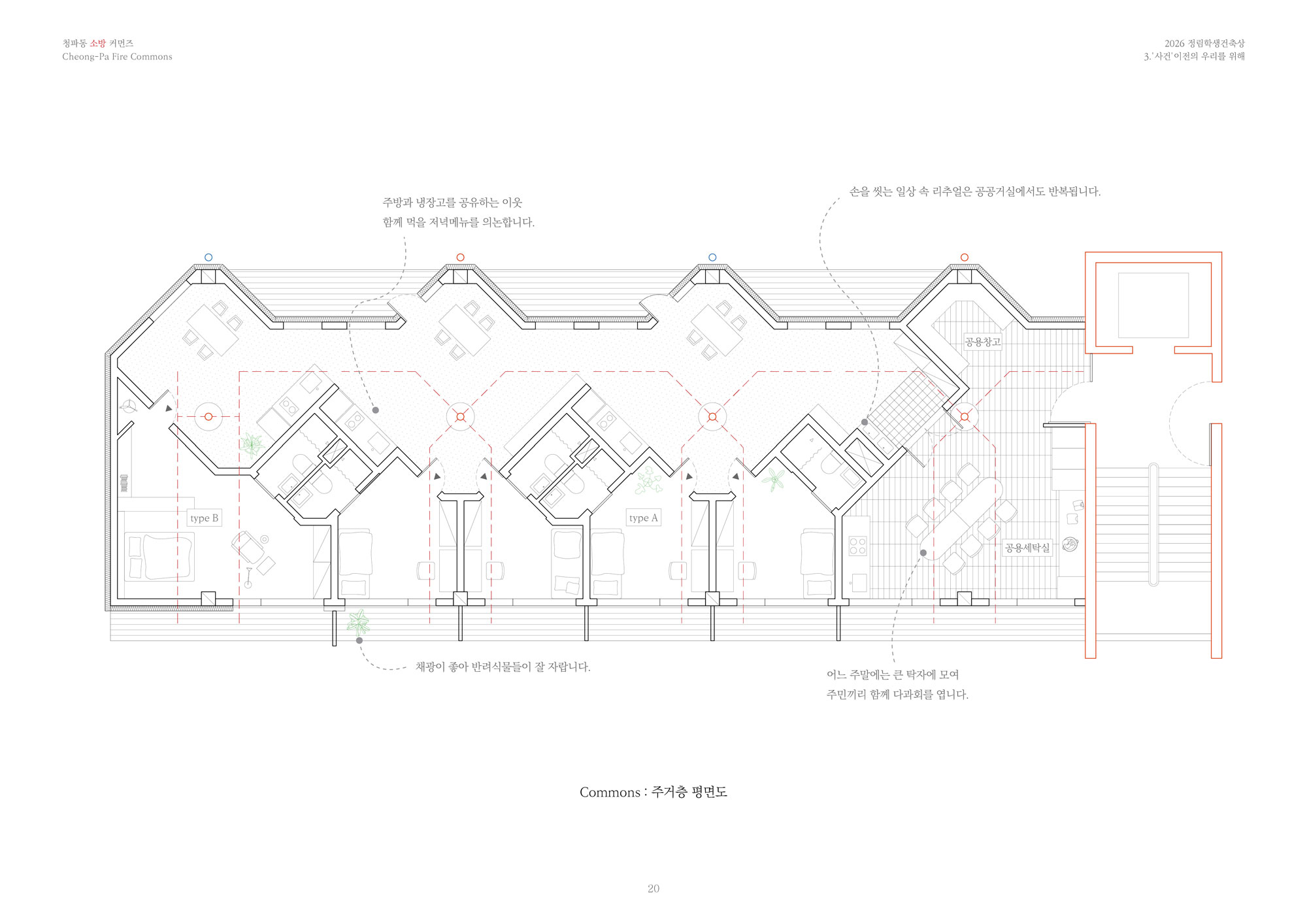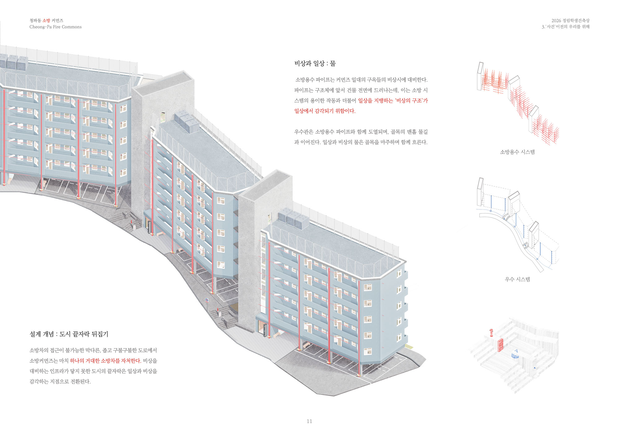 "(...) 소방차가 접근이 불가한 골목을 마주한 건물은 하나의 거대한 소방차처럼 작동하며, 골목의 형상에 맞게 삽입된 건축은 주변 구옥의 비상 상황을 대비하는 인프라가 된다. 이러한 건축이 여러 지점에 분산 배치되면 마을 단위의 새로운 질서가 형성된다. 기존 소방시스템이 닿지 못했던 골목은 새로운 건축을 매개로 작은 공동체 단위에서 작동하게 되고, 점 단위의 개인이 시스템의 핵심이 된다. 건축가는 그 사이에서 수평적인 소통과 조율을 담당하며, 비상의 대비는 점차 일상을 묶어주는 연대의 기반으로 전환된다." |