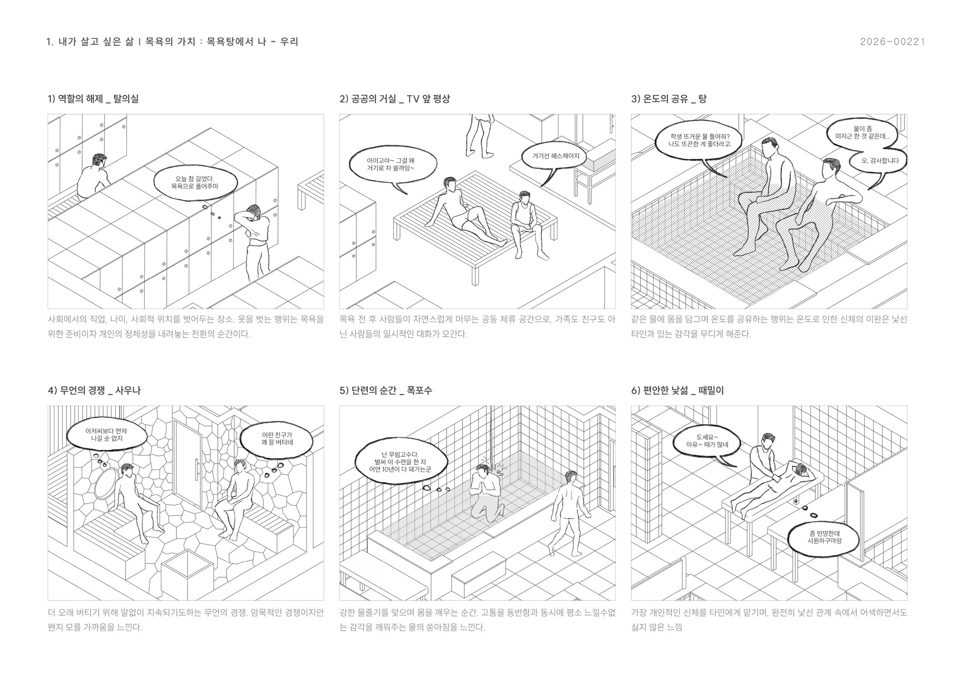 "(...) 오늘날 목욕탕은 점점 사라지고 있다. 가정 내 위생시설의 보편화와 시간 효율, 프라이버시의 중시는 목욕탕의 필요를 감소시켰고, 그와 함께 공동체적 경험 또한 희미해지고 있다. 우리는 이러한 상황에서 기존 목욕탕을 그대로 복원하는 것이 아니라, 목욕의 가치를 현대 도시 속에 새롭게 작동시키는 방법을 고민하였다. 이에 따라 목욕을 특정 건물에 한정된 기능이 아닌, 일상의 흐름 속에 스며드는 경험으로 재구성하고자 했다. (...)" |