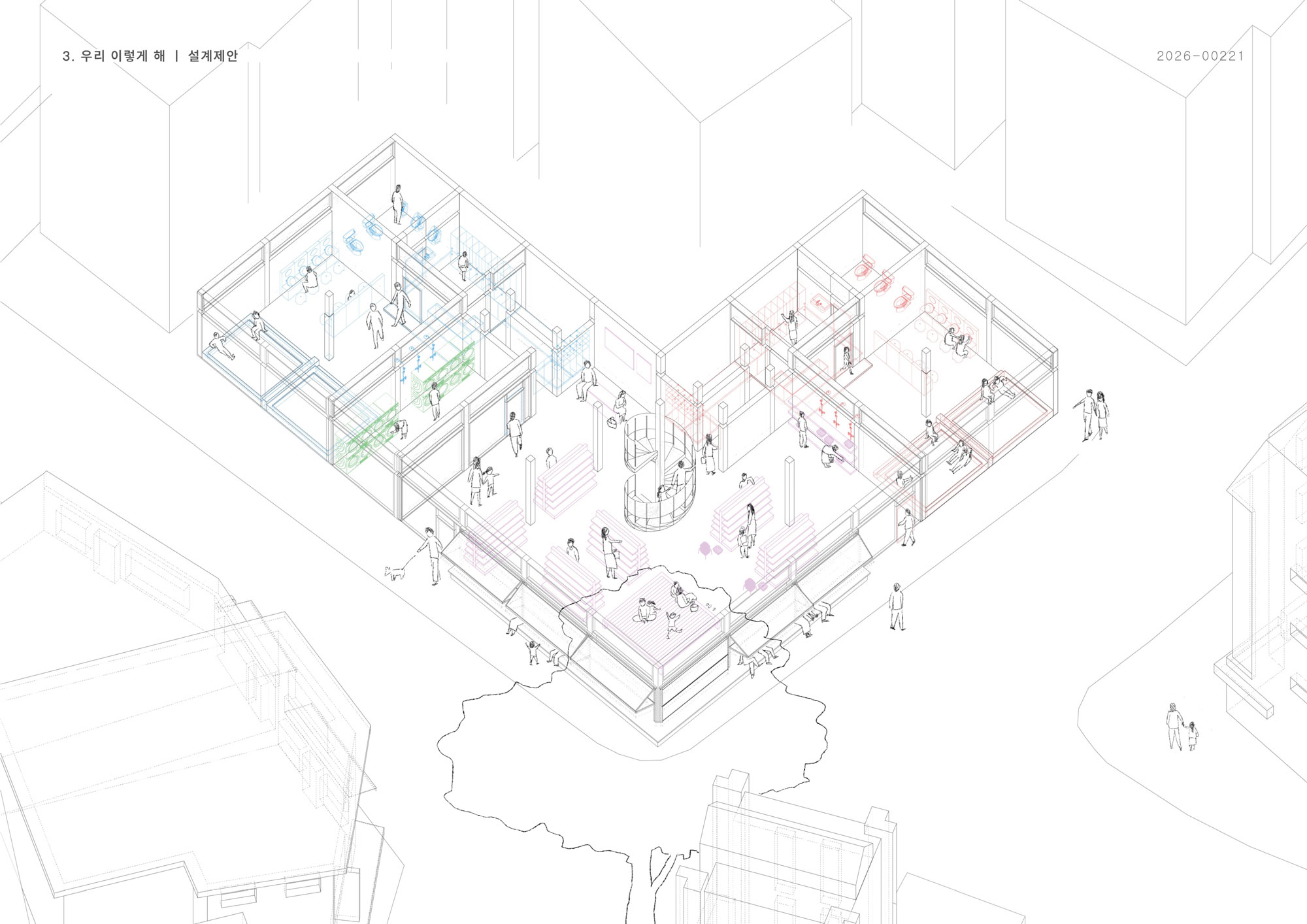 이번 공모전에는 총 388팀이 참가 신청했고, 그중 263팀이 과제를 제출했습니다. 약 한 달 간의 심사를 거쳐 15개 팀이 최종 공개 심사에 진출했습니다. 올해 수상작은 기획과 리서치, 스토리텔링 측면에서 다양한 접근과 높은 완성도를 보여주었습니다. 작은 마을의 인간관계와 공간 구조, 이웃이 협력해야 하는 긴급 상황, 목욕의 사회적 의미, 일과 삶을 함께하는 동료 관계 등 다양한 주제를 통해 무엇이 ‘우리’를 형성하는지 탐구했습니다. 특히 ‘나’와 ‘우리’를 사유, 공유, 점유 등 사회, 경제적 시스템 속에서 재해석하거나, 리모델링을 주요 방법론으로 삼고 미장, 가구 유닛, 비계 시스템 등을 통해 기존 도시와 건축 공간을 재구성하려는 시도가 두드러졌습니다. |