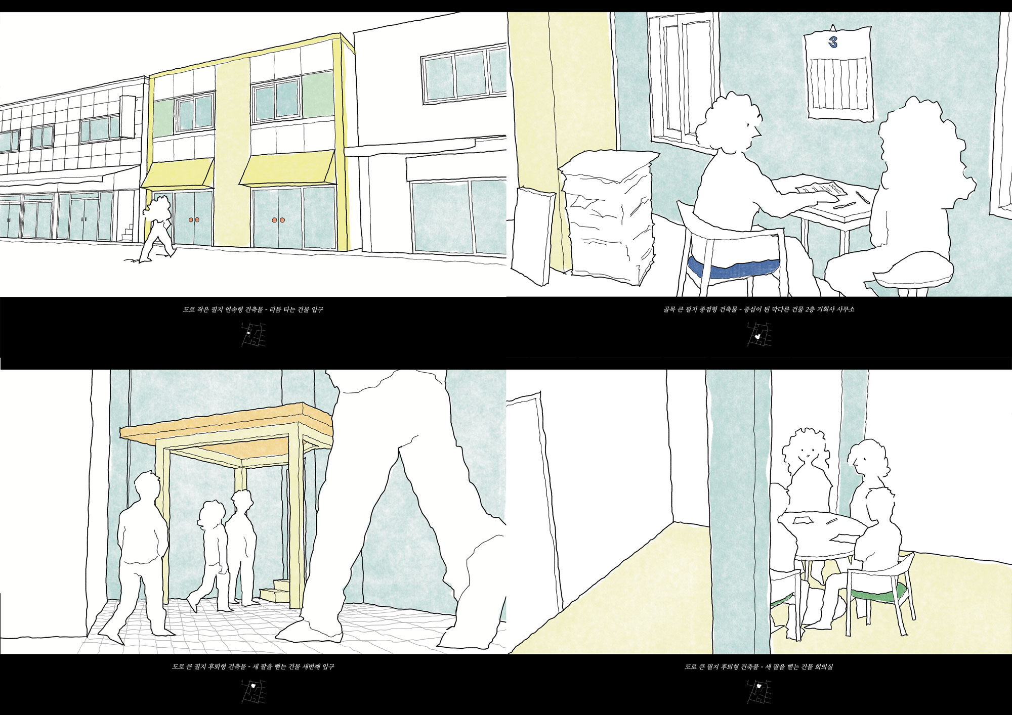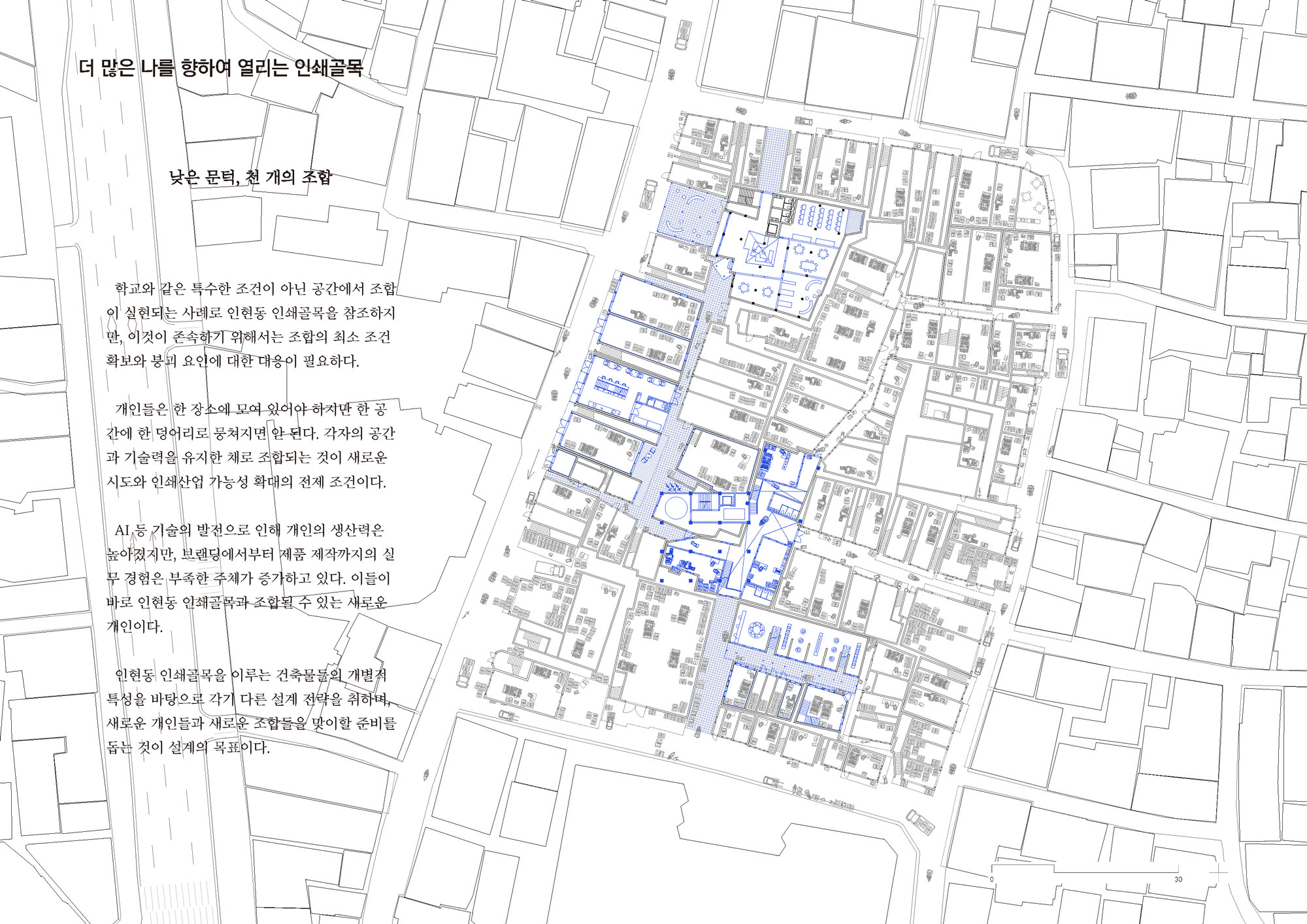 "(...) 이 설계는 새로운 개인들이 인현동의 조합 구조 안으로 들어올 수 있는 기반을 마련하는 것을 목표로 한다. 길의 폭과 필지 규모라는 두 척도에 따라 블록 내 건축물을 네 가지로 분류하고, 각 부지 특성에 맞는 설계 전략을 통해, 인현동이 새로운 개인과 새로운 조합을 맞이할 준비를 돕는다. (...)" |